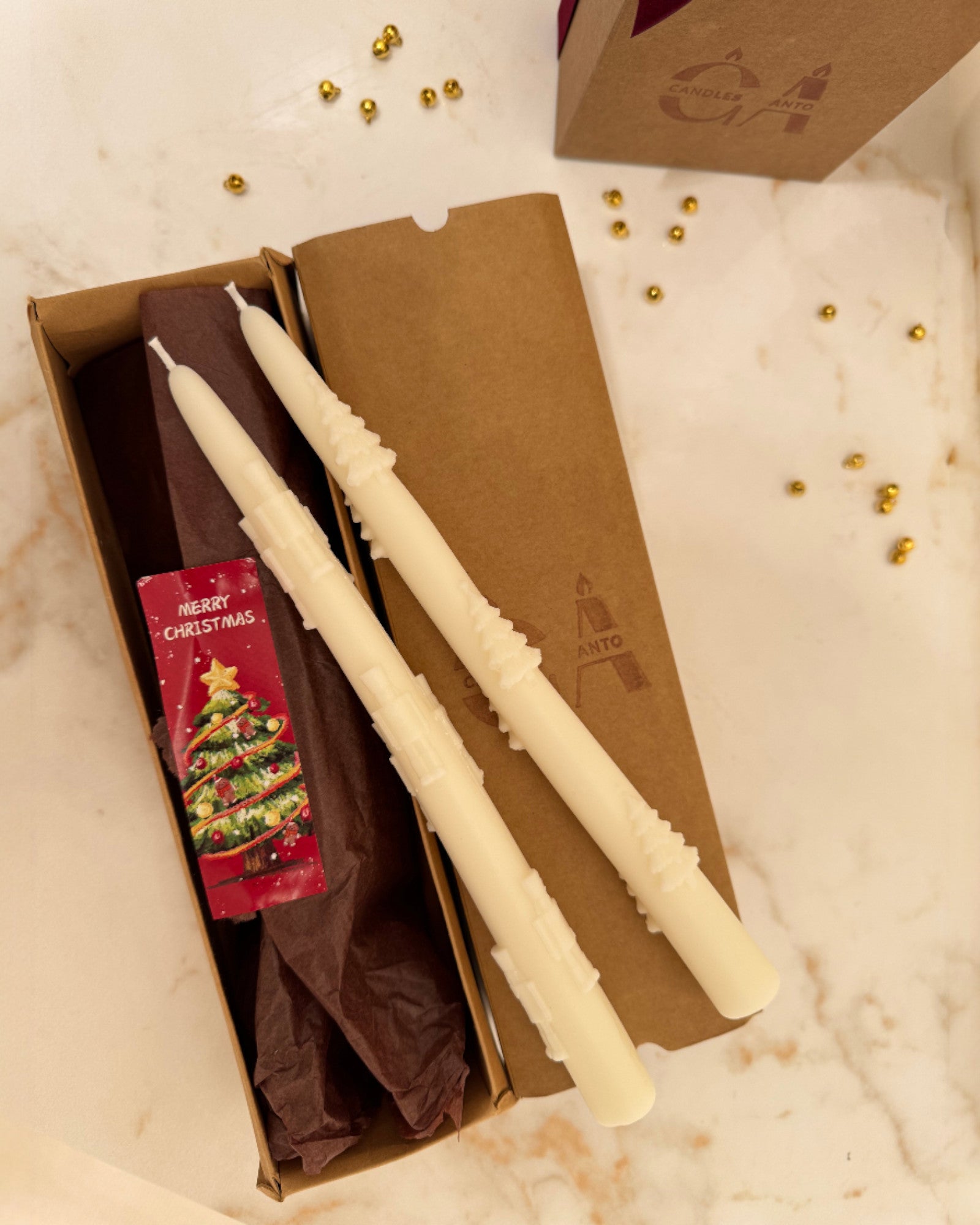 Box estraibile con 2 candele artigianali per candelabri: una con alberi di Natale in rilievo e una con schiaccianoci. Realizzate a mano con cura, sono perfette per decorare le vostre tavole natalizie.
