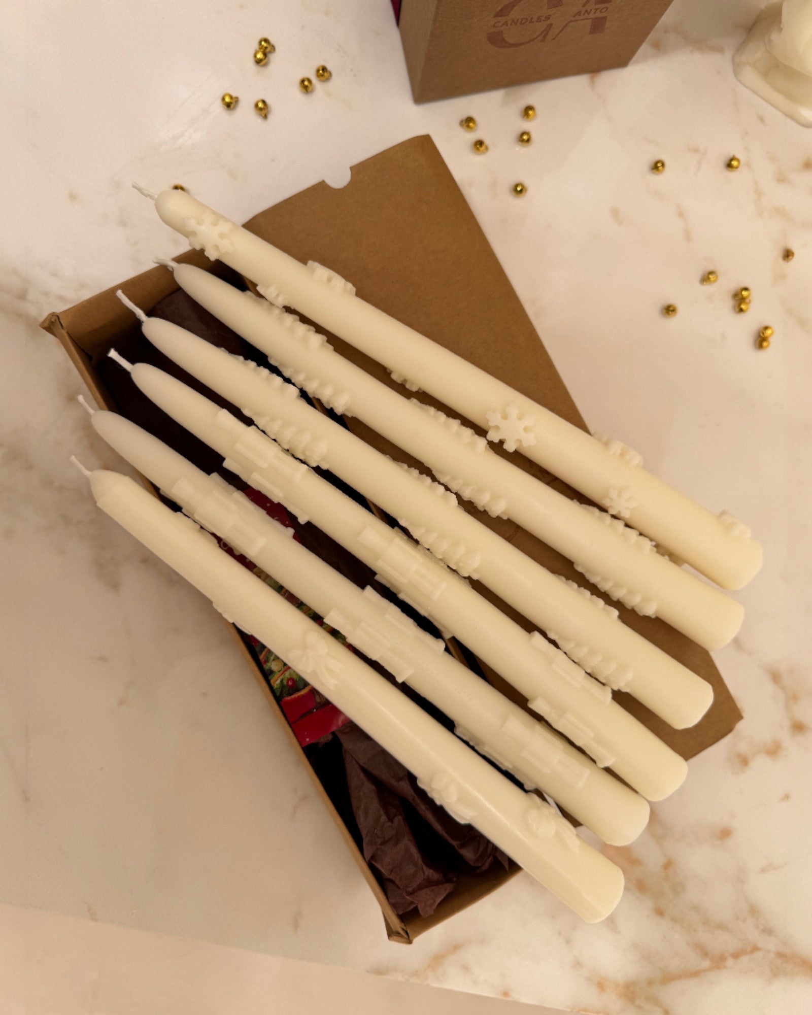 Box estraibile con 6 candele artigianali per candelabri: 2 con alberi di Natale in rilievo,2 con schiaccianoci, una con fiocchi e infine una con la neve. Realizzate a mano con cura, sono perfette per decorare le vostre tavole natalizie.