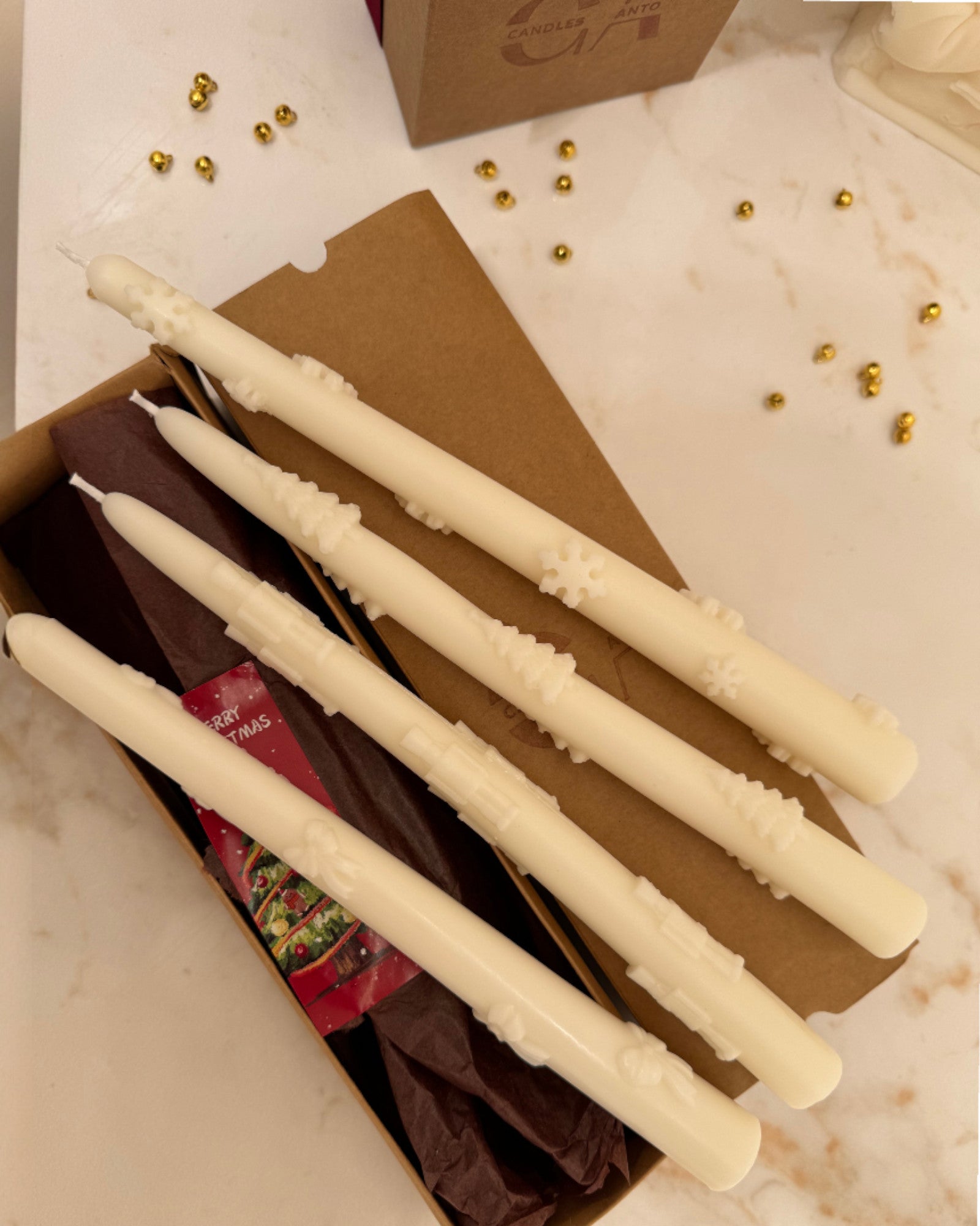 Box estraibile con 4 candele artigianali per candelabri: una con alberi di Natale in rilievo,una con schiaccianoci, una con fiocchi e infine una con la neve. Realizzate a mano con cura, sono perfette per decorare le vostre tavole natalizie.
