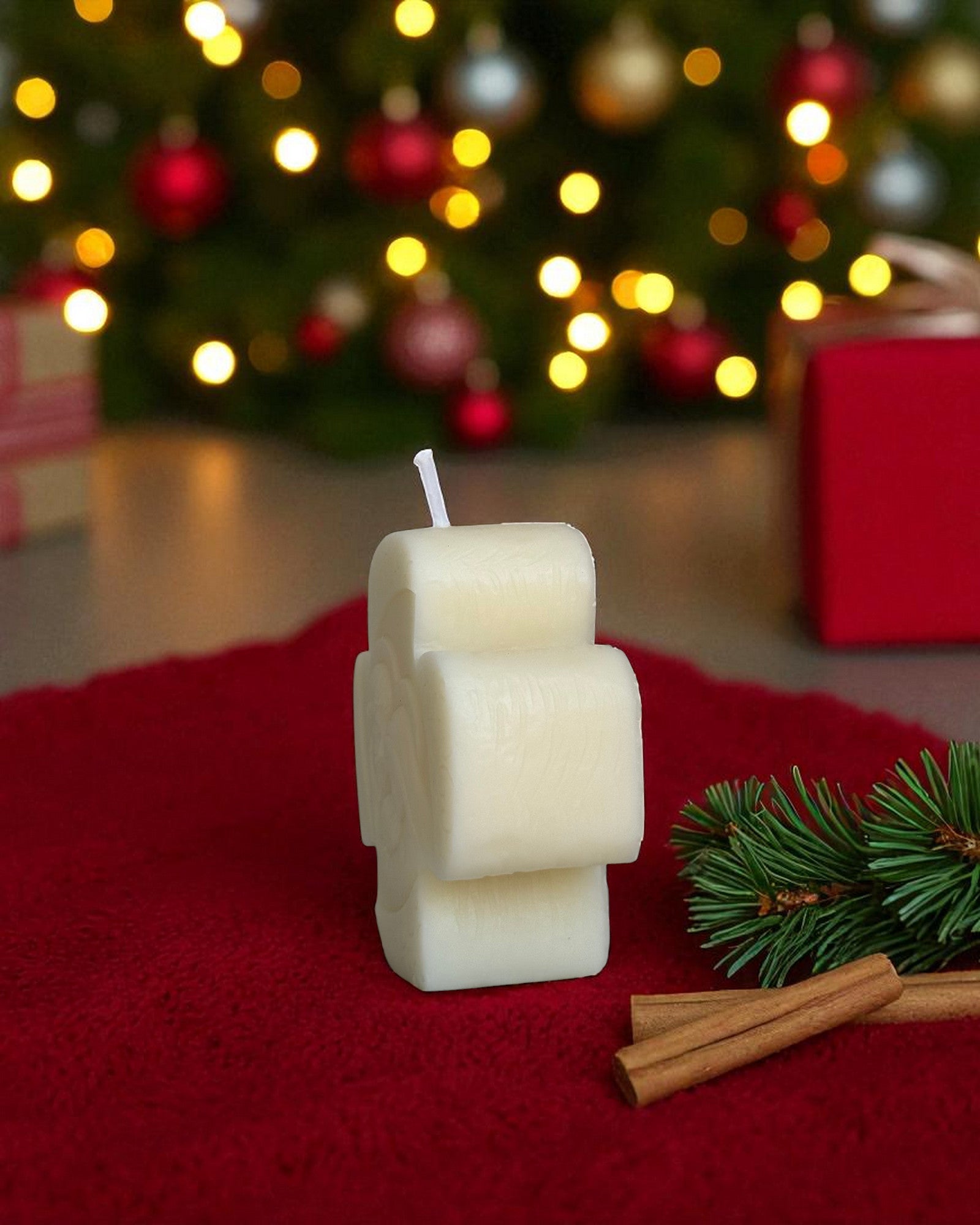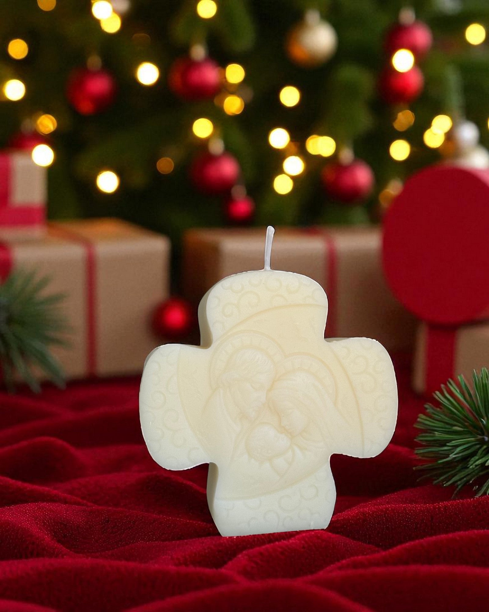 Candela artigianale a forma di croce con incisione della Sacra Famiglia. Un simbolo di fede e rinascita, perfetto come decorazione natalizia o come dono speciale.