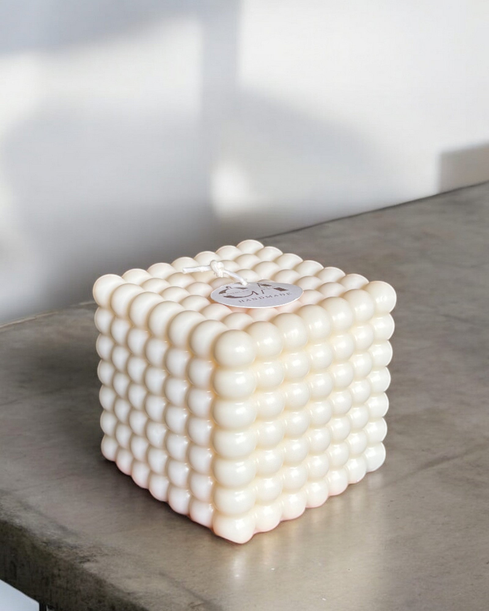Una candela cubica composta da tante palline arrotondate che formano una struttura geometrica pulita e moderna. Perfetta per un arredamento minimalista.