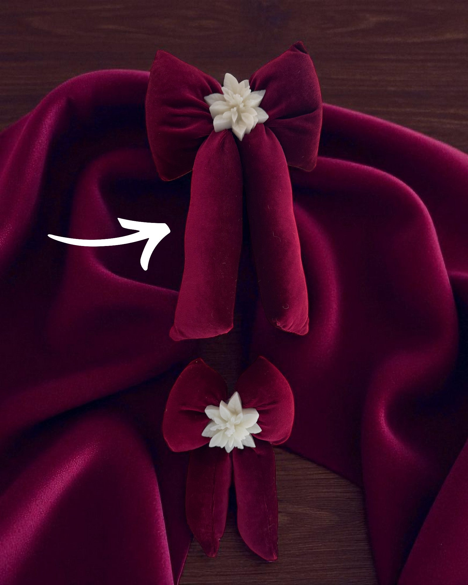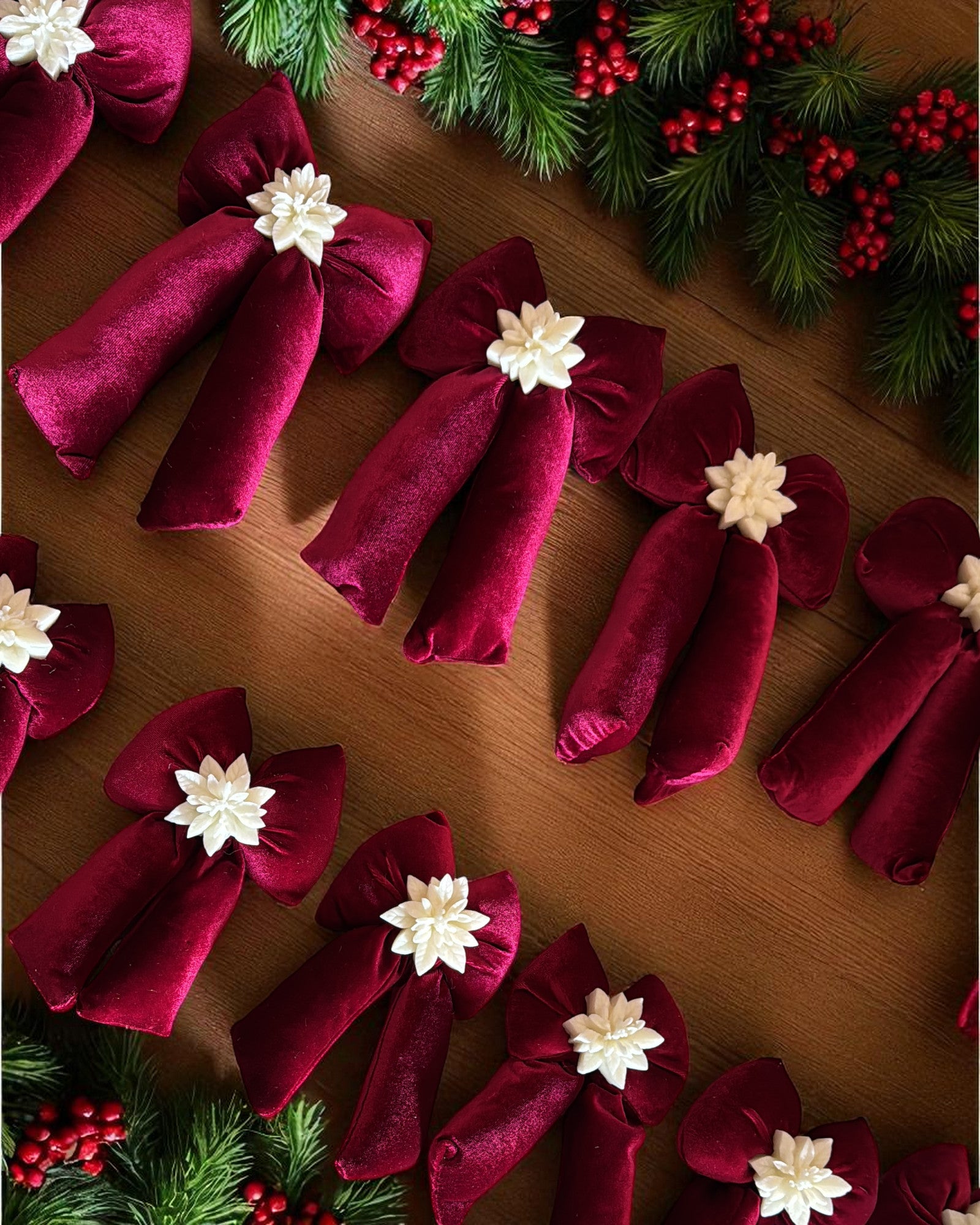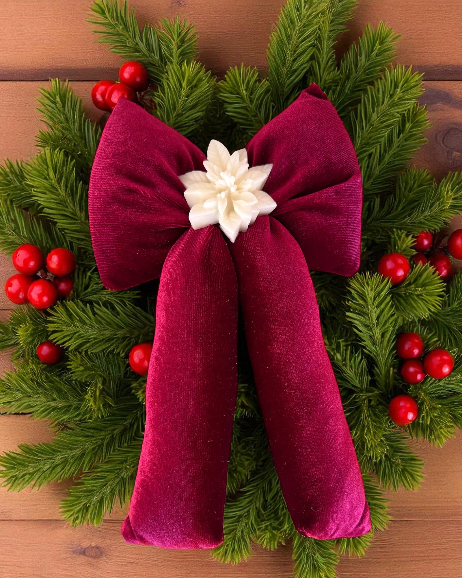 Fiocco Susy è un fiocco in tessuto con al centro una cialda di candela profumata alla fragranza natalizia, realizzata in cera di soia naturale.