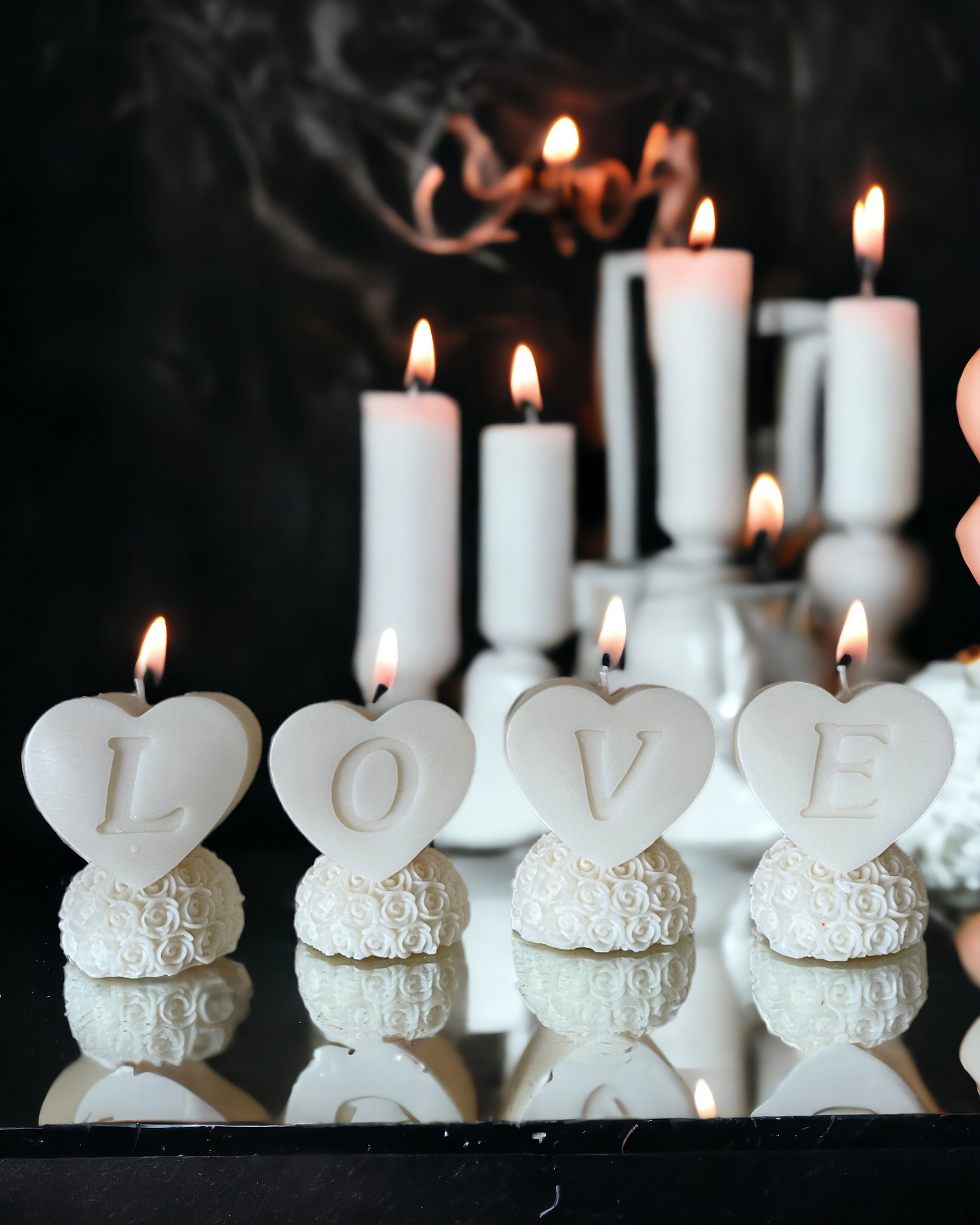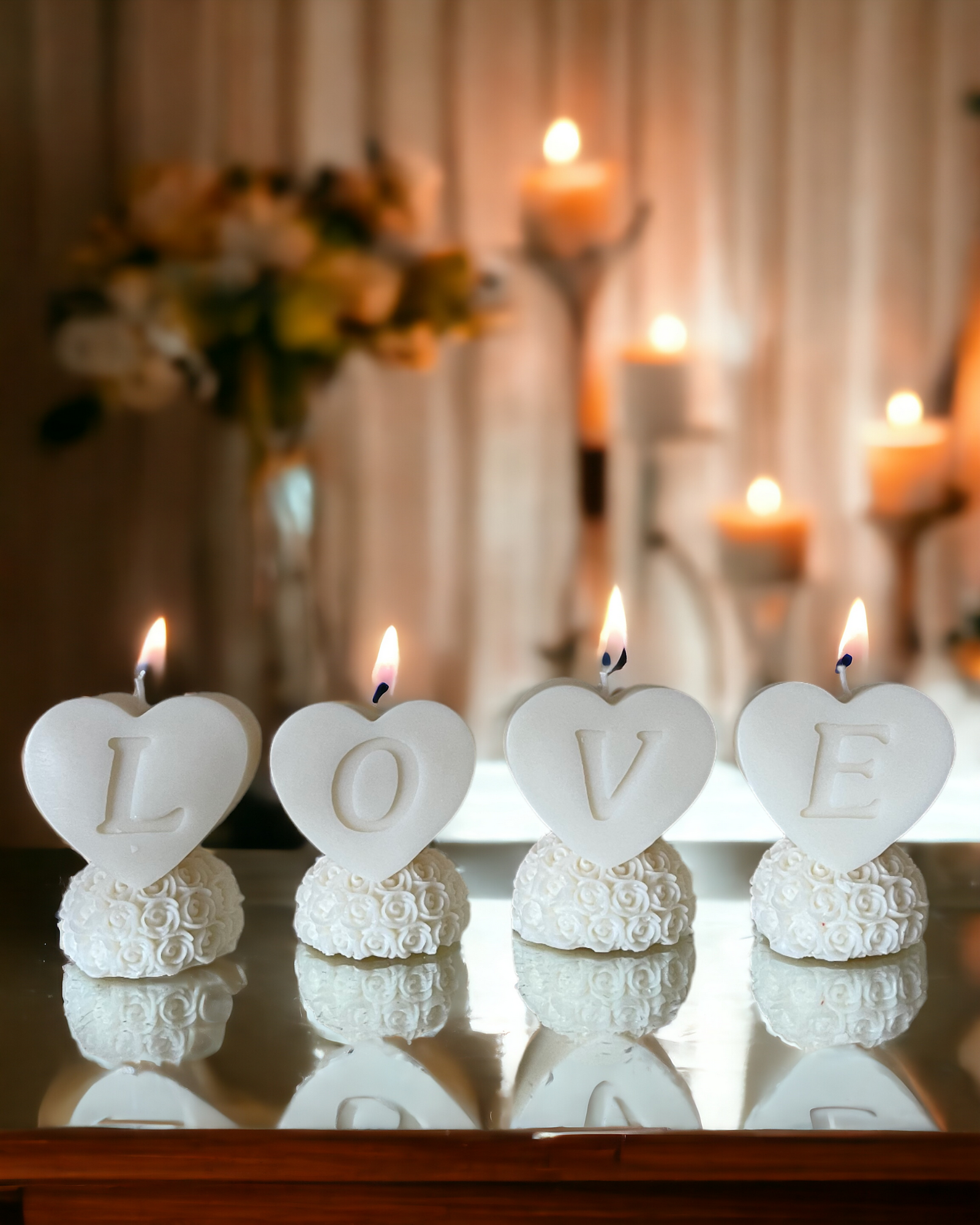Scritta Love. Composta da 4 singole candele di cera di soia ognuna con un peso di 100g. NON ACQUISTABILE SEPARATAMENTE.