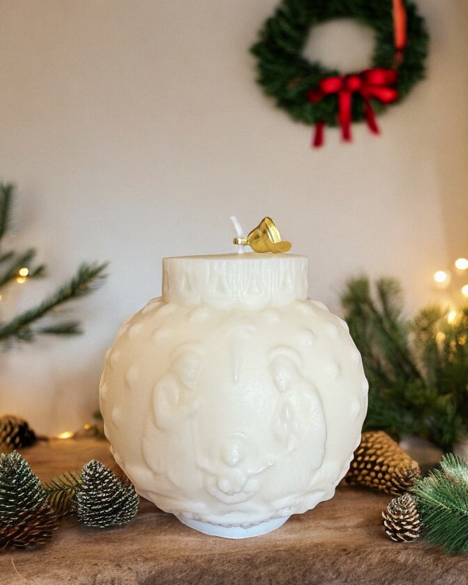 Candela sferica a forma di pallina di Natale con in rilievo la scena della Natività. Il design elegante e tridimensionale aggiunge un tocco contemporaneo alla tradizione, perfetto per decorazioni natalizie che uniscono spiritualità e stile moderno.