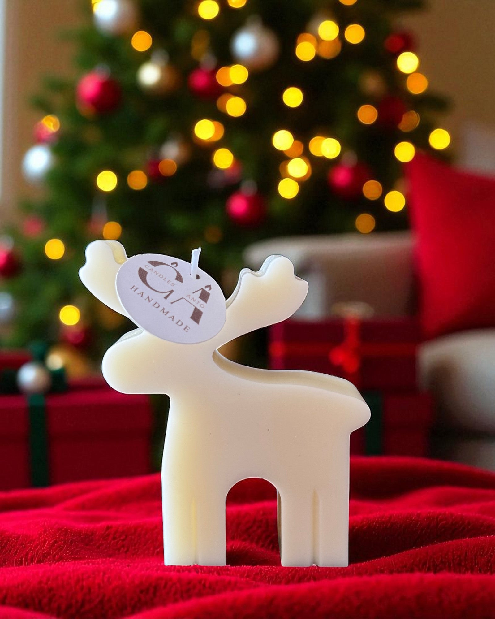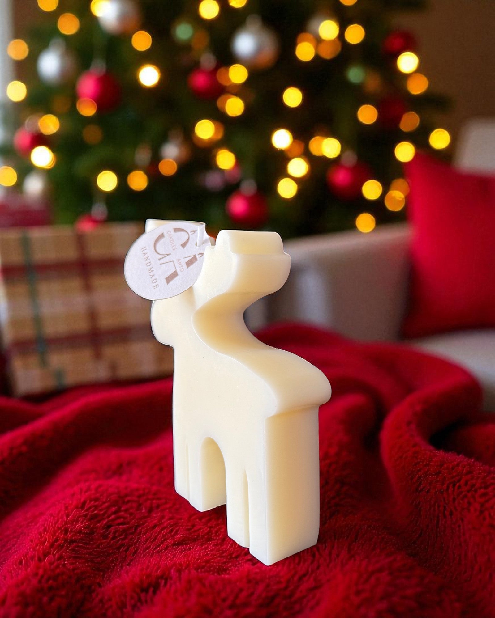 Candela artigianale a forma di renna natalizia perfetta come decoro o piccolo dono delle feste.